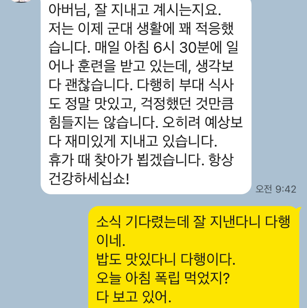 요즘은 훈련소에서도 주말이면 휴대폰을 사용할 시간을 준다고 했다.