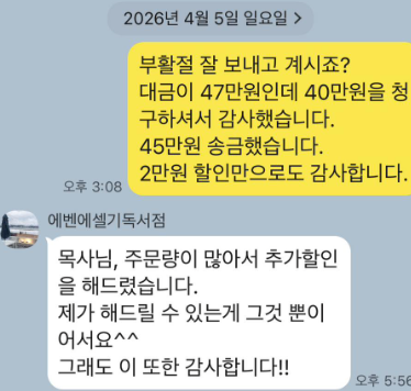 바로 45만원을 송금하고 톡을 드렸다.