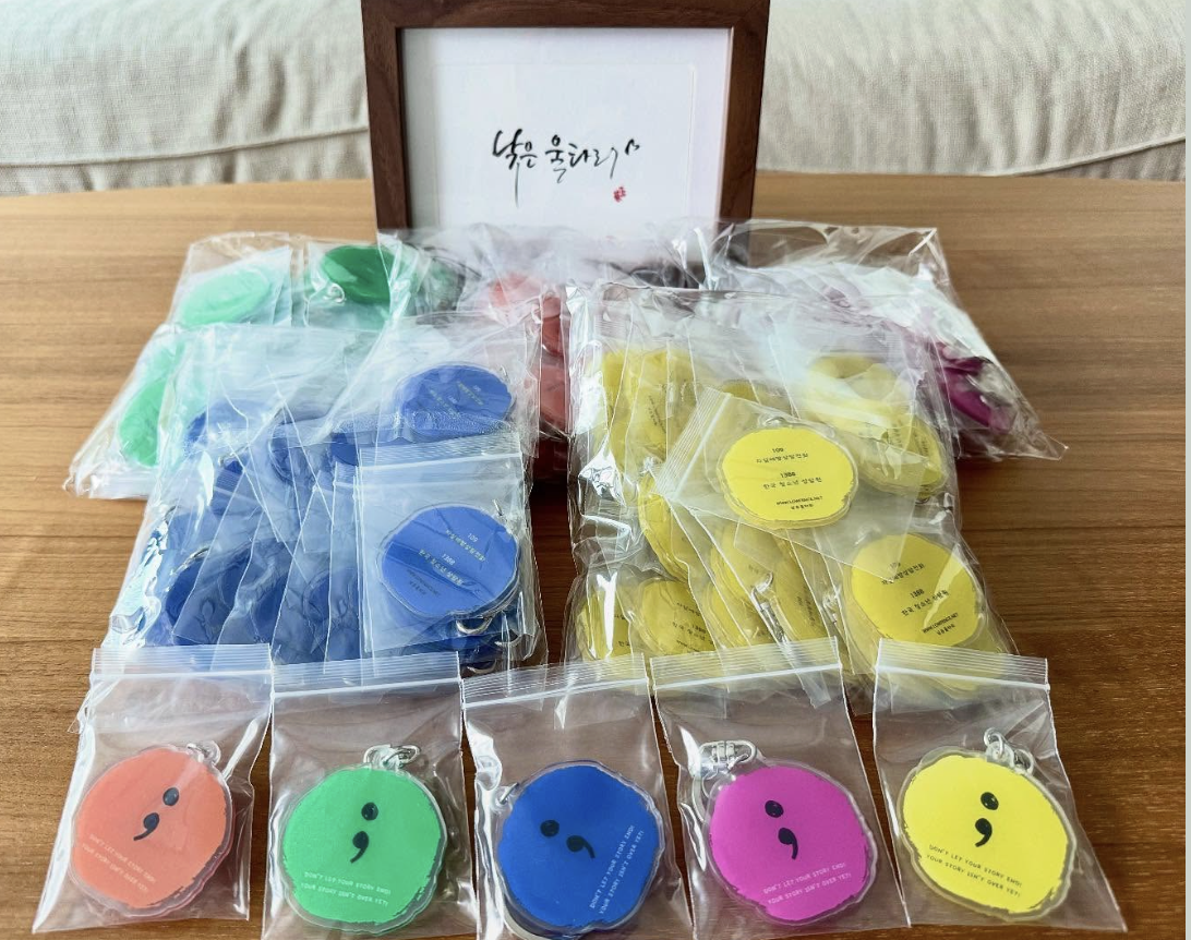 2013년부터 전세계적으로 자살예방을 의미하는 세미콜론 디자인이 들어간 키링이 도착했다.
