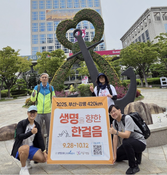자살예방운동단체인 라이프호프의 김주선 국장님이 9월 28일(주일)부터 10월 12일(주일)까지 15일간 부산-강릉 420km를 ‘생명을 향한 한걸음’이란 제목으로 걸었다. 2년 전인 2023년 9월에 김 국장님은 부산-서울 경부선 구간을 걸었다. 그때 내가 호포역에서 원동역까지 …