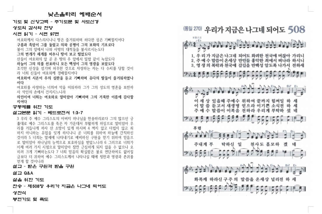 공동체를 위한 기도시간을 시작하시고 마무리하시는 하나님,다사다난했던 2025년을 하나님의 은혜 속에서 보내게 하시고, 2025년의 마지막 주일을 맞아 낮은울타리 식구들이 모여 예배하게 하시니 감사합니다.시간은 멈추지 않지만 그 시간의 매듭 앞에 잠깐 멈춰서 …